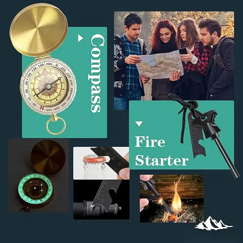 Prepare for any outdoor challenge with the 18in1 Outdoor Survival Kit Emergency Tools First Aid. This compact, pocket-sized multi-tool kit combines 18 essential tools into one portable package, giving you reliable emergency readiness wherever you go. Designed for outdoor lovers, travelers, campers, hikers, and explorers, it delivers first aid essentials and practical survival gear in a single, easy-to-carry kit.