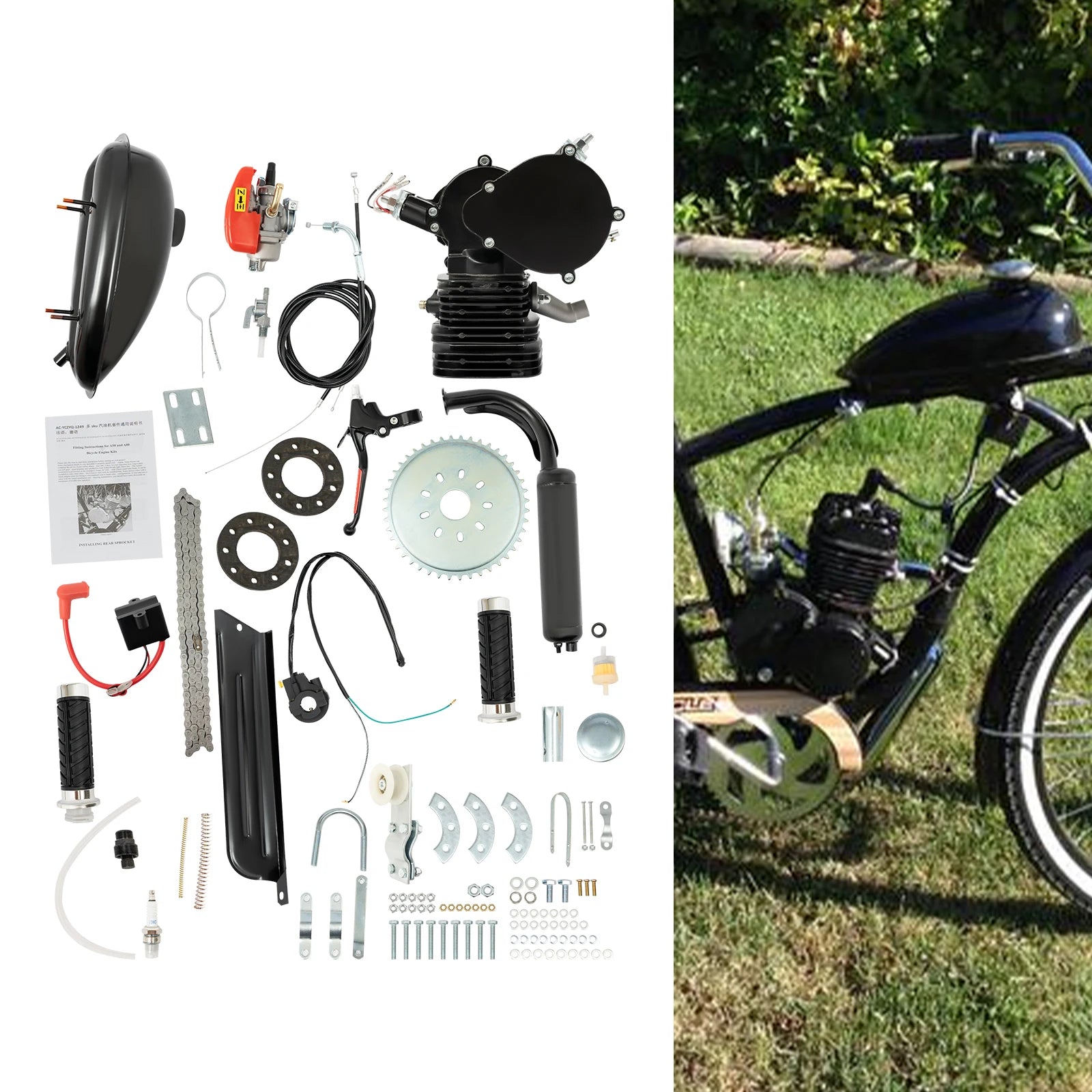 - Complete installation kit includes engine, CDI assembly, fuel tank, carburetor, exhaust, mounting hardware, cables, chain, and manual.