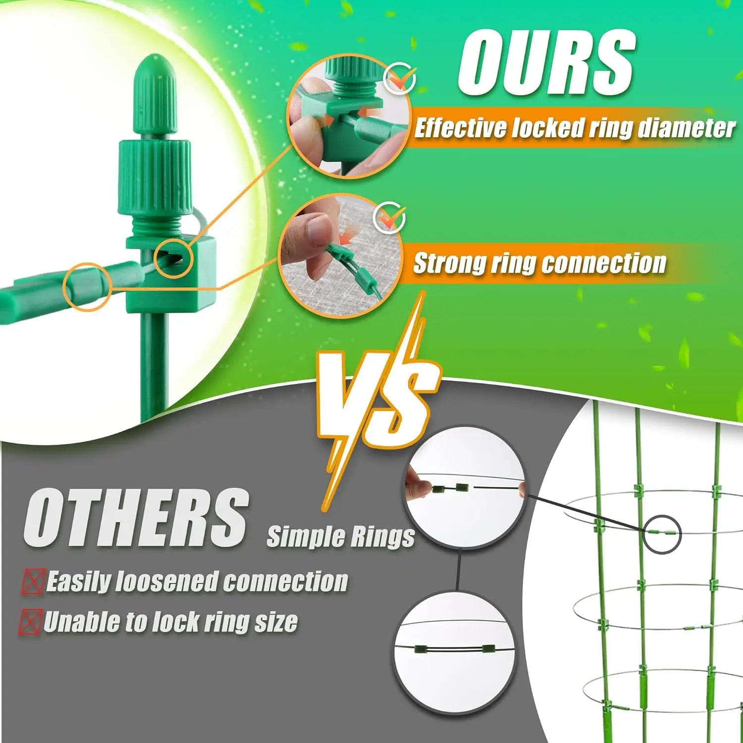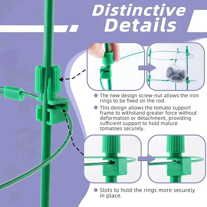 【Adjustable Design】 Our tomato cage features a unique nut-lock system, allowing height adjustment of support rods and diameter customization of rings (7.8-11 inches) to accommodate plants through all growth stages.