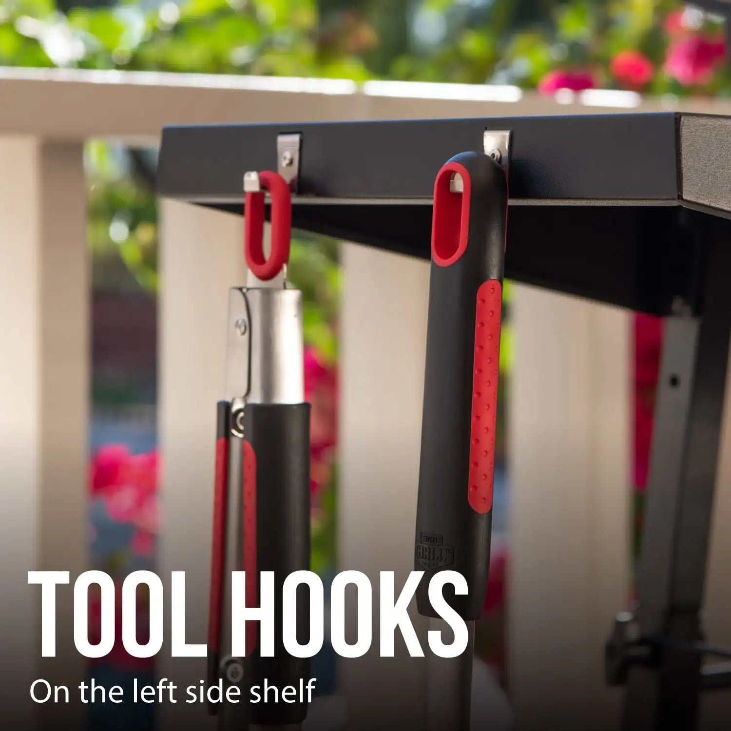 - Two fixed side shelves provide ample prep space, with attached hooks for convenient tool storage.
