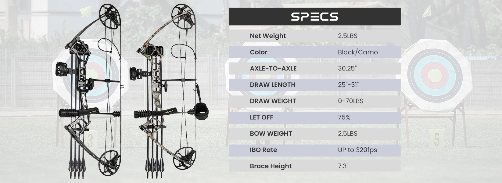 【Specifications】: Axle-to-Axle 30.25", Brace Height 7.3", Draw Weight 0-70 LBS, Draw Length 25"-31", IBO Speed Up to 320FPS, Net Weight only 2.5 LBS.